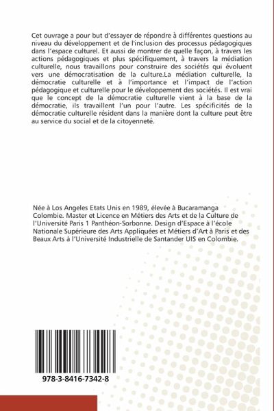 Cet ouvrage a pour but d'essayer de re pondre a diffe rentes questions au niveau du de veloppement et de l'inclusion des processus pe dagogiques dans l'espace culturel. Et aussi de montrer de quelle fac on, a travers les actions pe dagogiques et plus spe cifiquement, a travers la me diation culturelle, nous travaillons pour construire des socie te s qui e voluent vers une de mocratisation de la culture.La me diation culturelle, la de mocratie culturelle et a l'importance et l'impact de l'action pe dagogique et culturelle pour le de veloppement des socie te s. Il est vrai que le concept de la de mocratie culturelle vient a la base de la de mocratie, ils travaillent l'un pour l'autre. Les spe cificite s de la de mocratie culturelle re sident dans la manie re dont la culture peut e tre au service du social et de la citoyennete .