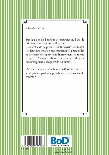 Pièce de théâtre.Sur la place du bonheur, se trouvent un banc de primeur et un kiosque de fleuriste.La marchande de primeurs et la fleuriste ont toutes les deux une relation très particulière, puisqu'elles se détestent et s'apprécient énormément en même temps. Autour d'eux, évoluent d'autres personnages tous en quête de bonheur.On cherche souvent le bonheur là où il n'est pas, alors qu'il est parfois si près de nous ! Sauront-ils le trouver ?