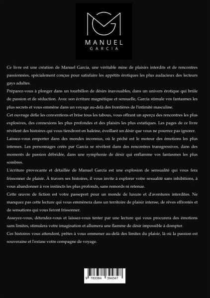 Ce livre est une création de Manuel Garcia, une véritable mine de plaisirs interdits et de rencontres passionnées, spécialement conçue pour satisfaire les appétits érotiques les plus audacieux des lecteurs gays adultes.Prépare-toi à te plonger dans un tourbillon de désirs inavouables, dans un univers érotique qui brûle de passion et de séduction. Avec son écriture magnétique et sensuelle, Garcia stimule tes fantasmes les plus secrets, t'emmenant dans un voyage au-delà des frontières de l'intimité masculine.Cet ouvrage défie les conventions et brise tous les tabous, t'offrant un aperçu des rencontres les plus explosives, des connexions les plus profondes et des plaisirs les plus extatiques. Les pages de ce livre révèlent des histoires qui te tiendront collé aux mots, éveillant un désir que tu ne pourras pas ignorer.Laisse-toi emporter dans des mondes inconnus, où le péché est le moteur des émotions les plus intenses. Les personnages créés par García se révèlent dans des rencontrestransgressives, dans des moments de passion débridée, dans une symphonie de désir qui enflamme tes fantasmes les plus sombres.L'écriture provocante et détaillée de Manuel García est une explosion de sensualité qui te fera frissonner de plaisir. À travers ses histoires, il t'invite à explorer ta sexualité sans inhibitions, à t'abandonner à tes instincts les plus profonds, sans remords ni retenue.Cette oeuvre de fiction est ton passeport pour un monde de luxure et d'aventures interdites. Ne manque pas cette lecture qui t'emmènera dans un territoire de plaisir intense, de rêves effrontés et de sensations qui te feront frissonner.Assieds-toi, détends-toi et laisse-toi aller à une lecture qui te procurera des émotions sans limites, stimulera ton imagination et allumera une flamme de désir qui ne peut être apprivoisée.Ces histoires t'attendent, prêtes à t'emmener au-delà des limites du plaisir, là où la passion est souveraine et où l'extase est ton compagnon de voyage.