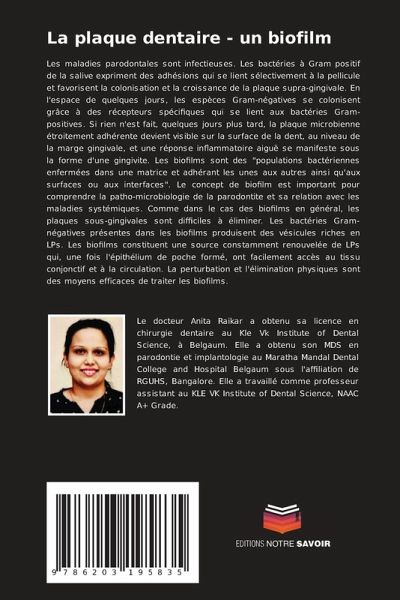 Les maladies parodontales sont infectieuses. Les bactéries à Gram positif de la salive expriment des adhésions qui se lient sélectivement à la pellicule et favorisent la colonisation et la croissance de la plaque supra-gingivale. En l'espace de quelques jours, les espèces Gram-négatives se colonisent grâce à des récepteurs spécifiques qui se lient aux bactéries Gram-positives. Si rien n'est fait, quelques jours plus tard, la plaque microbienne étroitement adhérente devient visible sur la surface de la dent, au niveau de la marge gingivale, et une réponse inflammatoire aiguë se manifeste sous la forme d'une gingivite. Les biofilms sont des "populations bactériennes enfermées dans une matrice et adhérant les unes aux autres ainsi qu'aux surfaces ou aux interfaces". Le concept de biofilm est important pour comprendre la patho-microbiologie de la parodontite et sa relation avec les maladies systémiques. Comme dans le cas des biofilms en général, les plaques sous-gingivales sont difficiles à éliminer. Les bactéries Gram-négatives présentes dans les biofilms produisent des vésicules riches en LPs. Les biofilms constituent une source constamment renouvelée de LPs qui, une fois l'épithélium de poche formé, ont facilement accès au tissu conjonctif et à la circulation. La perturbation et l'élimination physiques sont des moyens efficaces de traiter les biofilms.