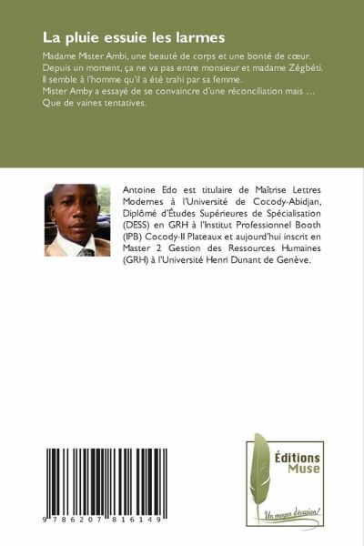 Antoine Edo est titulaire de Maîtrise Lettres Modernes à l'Université de Cocody-Abidjan, Diplômé d'Études Supérieures de Spécialisation (DESS) en GRH à l'Institut Professionnel Booth (IPB) Cocody-II Plateaux et aujourd'hui inscrit en Master 2 Gestion des Ressources Humaines (GRH) à l'Université Henri Dunant de Genève.