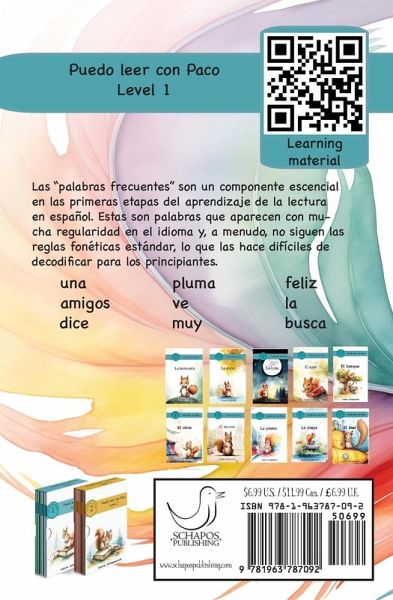 La Pluma En 'La Pluma', la séptima entrega encantadora de la serie 'Puedo Leer con Paco', nuestro curioso y siempre aventurero ardilla, Paco, encuentra una pluma bellamente multicolor durante una de sus exploraciones. Hipnotizado por su belleza y convencido de que pertenece a alguien muy especial, Paco se embarca en una búsqueda para encontrar a su legítimo dueño. Su viaje está lleno de encuentros con amigos que sugieren que la pluma podría pertenecer a un hermoso pájaro, despertando la imaginación y determinación de Paco. A lo largo del camino, Paco aprende sobre la diversidad de aves y la importancia de devolver lo que no nos pertenece, enriqueciendo su comprensión del mundo natural que lo rodea. Su aventura culmina en una conclusión conmovedora cuando finalmente conoce al dueño de la pluma, un magnífico pájaro, reuniéndolos en una celebración de amistad y los vibrantes colores de la vida. 'La Pluma' es un cuento vívidamente ilustrado que enseña a los jóvenes lectores sobre la curiosidad, la responsabilidad y la alegría del descubrimiento, todo mientras los introduce a la belleza del arte de la naturaleza. The feather In 'La Pluma,' the seventh enchanting installment of the 'Puedo Leer con Paco' series, our curious and ever-adventurous squirrel, Paco, stumbles upon a beautifully multicolored feather during one of his explorations. Mesmerized by its beauty and convinced it belongs to someone very special, Paco embarks on a quest to find its rightful owner. His journey is filled with encounters with friends who suggest the feather might belong to a beautiful bird, sparking Paco's imagination and determination. Along the way, Paco learns about the diversity of birds and the importance of returning what isn't ours, enriching his understanding of the natural world around him. His adventure culminates in a heartwarming conclusion when he finally meets the feather's owner, a magnificent bird, reuniting them in a celebration of friendship and the vibrant colors of life. 'La Pluma' is a vividly illustrated tale that teaches young readers about curiosity, responsibility, and the joy of discovery, all while introducing them to the beauty of nature's artwork.
