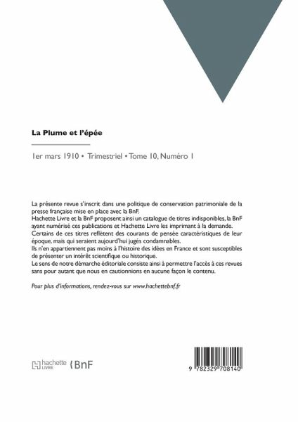 La Plume et l'épée Date de l'édition originale: 1910-03-01 La présente revue s'inscrit dans une politique de conservation patrimoniale de la presse française mise en place avec la BnF. Hachette Livre et la BnF proposent ainsi un catalogue de titres indisponibles, la BnF ayant numérisé ces publications et Hachette Livre les imprimant à la demande. Certains de ces titres reflètent des courants de pensée caractéristiques de leur époque, mais qui seraient aujourd'hui jugés condamnables. Ils n'en appartiennent pas moins à l'histoire des idées en France et sont susceptibles de présenter un intérêt scientifique ou historique. Le sens de notre démarche éditoriale consiste ainsi à permettre l'accès à ces revues sans pour autant que nous en cautionnions en aucune façon le contenu. Pour plus d'informations, rendez-vous sur www.hachettebnf.fr