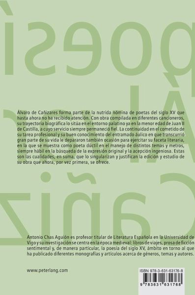 Álvaro de Cañizares forma parte de la nutrida nómina de poetas del siglo XV que hasta ahora no ha recibido atención. Con obra compilada en diferentes cancioneros, su trayectoria biográfica lo sitúa en el entorno palatino ya en la menor edad de Juan II de Castilla, a cuyo servicio siempre permaneció fiel. La continuidad en el cometido de su tarea profesional y su buen conocimiento del entramado áulico en que transcurrió gran parte de su vida le depararon también ocasión para ejercitar su faceta literaria, en la que se muestra como poeta dúctil en el manejo de distintos temas y metros, siempre hábil en la búsqueda de la expresión original y la acepción ingeniosa. Cualidades, en suma, que lo singularizan y justifican la edición y estudio de su obra que ahora, por vez primera, se ofrece.