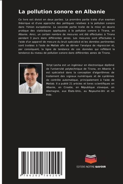 Ce livre est divisé en deux parties. La première partie traite d'un examen théorique et d'une approche des politiques relatives à la pollution sonore dans l'Union européenne. La seconde partie traite de la mise en oeuvre pratique des statistiques appliquées à la pollution sonore à Tirana, en Albanie. Ainsi, un certain nombre de mesures ont été effectuées à Tirana pendant 3 jours dans différentes zones. Les mesures sont effectuées à l'aide d'un appareil de mesure du bruit spécialisé et les données pertinentes sont traitées à l'aide de Matlab afin de dériver l'analyse de régression et, par conséquent, la ligne de tendance de ces données qui reflètent la tendance du niveau de pollution sonore dans différentes zones de Tirana.