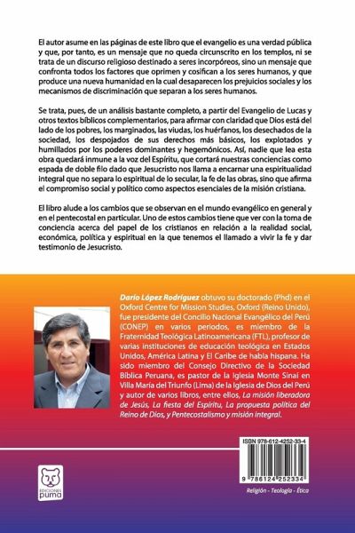 El autor asume en las páginas de este libro que el evangelio es una verdad pública y que, por tanto, es un mensaje que no queda circunscrito en los templos, ni se trata de un discurso religioso destinado a seres incorpóreos, sino un mensaje que confronta todos los factores que oprimen y cosifican a los seres humanos, y que produce una nueva humanidad en la cual desaparecen los prejuicios sociales y los mecanismos de discriminación que separan a los seres humanos. Se trata, pues, de un análisis bastante completo, a partir del Evangelio de Lucas y otros textos bíblicos complementarios, para afirmar con claridad que Dios está del lado de los pobres, los marginados, las viudas, los huérfanos, los desechados de la sociedad, los despojados de sus derechos más básicos, los explotados y humillados por los poderes dominantes y hegemónicos. Así, nadie que lea esta obra quedará inmune a la voz del Espíritu, que cortará nuestras conciencias como espada de doble filo dado que Jesucristo nos llama a encarnar una espiritualidad integral que no separa lo espiritual de lo secular, la fe de las obras, sino que afirma el compromiso social y político como aspectos esenciales de la misión cristiana. El libro alude a los cambios que se observan en el mundo evangélico en general y en el pentecostal en particular. Uno de estos cambios tiene que ver con la toma de conciencia acerca del papel de los cristianos en relación a la realidad social, económica, política y espiritual en la que tenemos el llamado a vivir la fe y dar testimonio de Jesucristo.