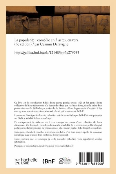 La popularite: comedie en 5 actes, en vers (3e edition) / par Casimir DelavigneCe livre est la reproduction fidele d'une oeuvre publiee avant 1920 et fait partie d'un projet propose par la Bibliotheque nationale de France (BnF), offrant l'opportunite pour les lecteurs, enseignants ou chercheurs d'acceder a des ouvrages anciens et souvent rares issus de ses fonds patrimoniaux.Les oeuvres de cette collection appartiennent au domaine public . Elles ont ete numerisees par la BnF et sont presentes sur Gallica, la bibliotheque numerique de la BnF.En entreprenant de redonner vie a ces oeuvres au travers d'une collection de livres reimprimes a la demande, nous offrons la possibilite a ces oeuvres de rencontrer un public elargi et participons a la transmission de connaissances et de savoirs difficilement accessibles par ailleurs.Sur un plan technique, nous avons cherche a concilier la reproduction fidele d'un livre ancien a partir de sa version numerisee avec le souci d'un confort de lecture optimal. Nous esperons que les ouvrages de cette nouvelle collection vous apporteront entiere satisfaction.http: //gallica.bnf.fr/ark: /12148/bpt6k279743