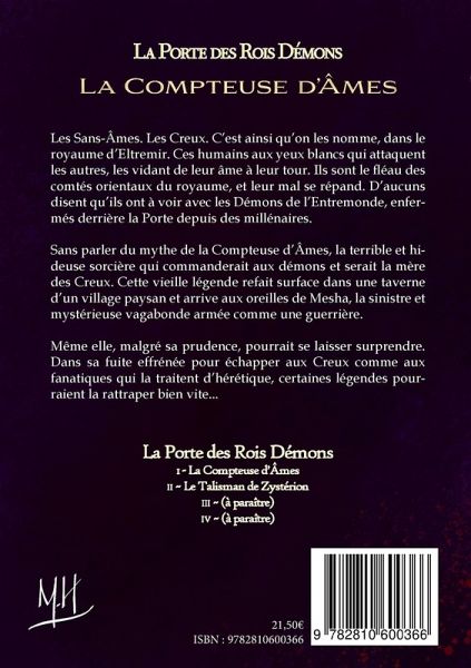 Les Sans-Âmes. Les Creux. C'est ainsi qu'on les nomme, dans le royaume d'Eltremir. Ces humains aux yeux blancs qui attaquent les autres, les vidant de leur âme à leur tour. Ils sont le fléau des comtés orientaux du royaume, et leur mal se répand. D'aucuns disent qu'ils ont à voir avec les Démons de l'Entremonde, enfermés derrière la Porte depuis des millénaires.Sans parler du mythe de la Compteuse d'Âmes, la terrible et hideuse sorcière qui commanderait aux démons et serait la mère des Creux. Cette vieille légende refait surface dans une taverne d'un village paysan et arrive aux oreilles de Mesha, la sinistre et mystérieuse vagabonde armée comme une guerrière.Même elle, malgré sa prudence, pourrait se laisser surprendre. Dans sa fuite effrénée pour échapper aux Creux comme aux fanatiques qui la traitent d'hérétique, certaines légendes pourraient la rattraper bien vite...