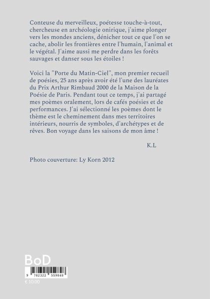 Voici la "Porte du Matin-Ciel", mon premier recueil de poésies, 25 ans après avoir été l'une des lauréates du Prix Arthur Rimbaud 2000 de la Maison de la Poésie de Paris. Pendant tout ce temps, j'ai partagé mes poèmes oralement, lors de café-poésies et de performances. J'ai sélectionné les poèmes dont le thème est le cheminement dans mes territoires intérieurs, nourris de symboles, d'archétypes et de rêves. Bon voyage dans les saisons de mon âme !