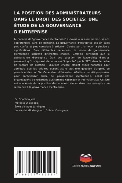 Le concept de "gouvernance d'entreprise" a évolué à la suite de discussions approfondies dans ce domaine. La gouvernance d'entreprise est un sujet plus confus et plus complexe à articuler. D'autre part, la notion a plusieurs significations. Pour différentes personnes, le terme de gouvernance d'entreprise signifiait différentes choses. Certains pensaient que la gouvernance d'entreprise était une question de leadership; d'autres pensaient qu'il s'agissait de la norme "imposée" par la SEBI dans le cadre de l'accord de cotation ; d'autres encore étaient assez honnêtes pour admettre que les affaires étaient avant tout une question d'argent, de pouvoir et de contrôle. Cependant, différentes définitions ont été proposées pour caractériser l'idée de gouvernance d'entreprise, allant des organisations d'entreprises aux comités nationaux et internationaux. Ce livre est une étude de la position des administrateurs dans une entreprise en référence à la gouvernance d'entreprise.
