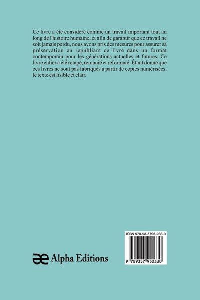 La Poupée, un livre classique, a été considéré comme important tout au long de l'histoire de l'humanité, et pour que cet ouvrage ne soit jamais oublié, chez Alpha Editions, nous avons fait des efforts pour sa préservation en rééditant ce livre dans un format moderne pour les générations présentes et futures. Tout ce livre a été reformaté, retapé et conçu. Ces livres ne sont pas constitués de copies numérisées de leur ¿uvre originale et le texte est donc clair et lisible.