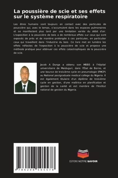 Les êtres humains sont toujours en contact avec des particules de poussière qui, avec le temps, s'accumulent dans les espaces pulmonaires et se manifestent plus tard par une limitation variée du débit d'air. L'exposition à la poussière de bois a de nombreux effets sur ceux qui sont exposés de près et de manière prolongée à ces particules, en particulier ceux qui travaillent dans l'industrie du bois. Ce livre met en lumière les effets néfastes de l'exposition à la poussière de scie et propose une méthode pratique pour atténuer ces effets catastrophiques de la poussière de scie.