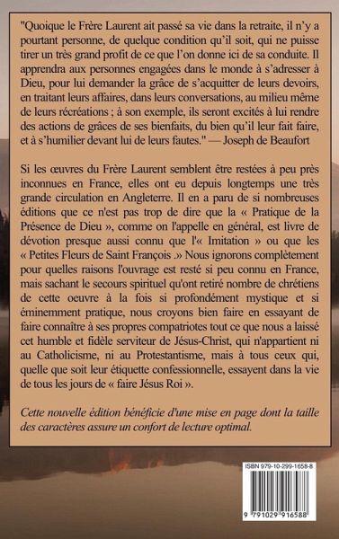 "Quoique le Frère Laurent ait passé sa vie dans la retraite, il n'y a pourtant personne, de quelque condition qu'il soit, qui ne puisse tirer un très grand profit de ce que l'on donne ici de sa conduite. Il apprendra aux personnes engagées dans le monde à s'adresser à Dieu, pour lui demander la grâce de s'acquitter de leurs devoirs, en traitant leurs affaires, dans leurs conversations, au milieu même de leurs récréations ; à son exemple, ils seront excités à lui rendre des actions de grâces de ses bienfaits, du bien qu'il leur fait faire, et à s'humilier devant lui de leurs fautes." - Joseph de Beaufort Si les uvres du Frère Laurent semblent être restées à peu près inconnues en France, elles ont eu depuis longtemps une très grande circulation en Angleterre. Il en a paru de si nombreuses éditions que ce n'est pas trop de dire que la Pratique de la Présence de Dieu , comme on l'appelle en général, est livre de dévotion presque aussi connu que l' Imitation ou que les Petites Fleurs de Saint François . Nous ignorons complètement pour quelles raisons l'ouvrage est resté si peu connu en France, mais sachant le secours spirituel qu'ont retiré nombre de chrétiens de cette oeuvre à la fois si profondément mystique et si éminemment pratique, nous croyons bien faire en essayant de faire connaître à ses propres compatriotes tout ce que nous a laissé cet humble et fidèle serviteur de Jésus-Christ, qui n'appartient ni au Catholicisme, ni au Protestantisme, mais à tous ceux qui, quelle que soit leur étiquette confessionnelle, essayent dans la vie de tous les jours de faire Jésus Roi . Cette nouvelle édition bénéficie d'une mise en page dont la taille des caractères assure un confort de lecture optimal.