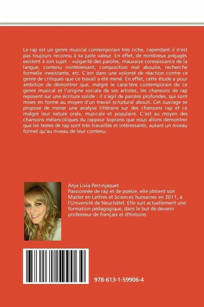 Le rap est un genre musical contemporain très riche, cependant il n'est pas toujours reconnu à sa juste valeur. En effet, de nombreux préjugés existent à son sujet - vulgarité des paroles, mauvaise connaissance de la langue, contenu inintéressant, composition mal aboutie, recherche formelle inexistante, etc. C'est dans une volonté de réaction contre ce genre de critiques que ce travail a été mené. En effet, cette étude a pour ambition de démontrer que, malgré le caractère contemporain de ce genre musical et l'origine sociale de ses artistes, les chansons de rap reposent sur une écriture solide : il s'agit de paroles profondes, qui sont mises en forme au moyen d'un travail scriptural abouti. Cet ouvrage se propose de mener une analyse littéraire sur des chansons rap et ce malgré leur nature orale, musicale et populaire. C'est au moyen des chansons mélancoliques du rappeur Soprano que nous allons démontrer que les textes de rap sont très travaillés et intéressants, autant un niveau formel qu'au niveau de leur contenu.