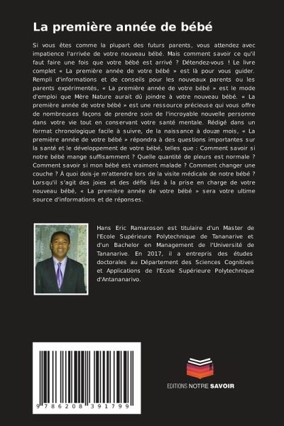 Si vous êtes comme la plupart des futurs parents, vous attendez avec impatience l'arrivée de votre nouveau bébé. Mais comment savoir ce qu'il faut faire une fois que votre bébé est arrivé ? Détendez-vous ! Le livre complet « La première année de votre bébé » est là pour vous guider. Rempli d'informations et de conseils pour les nouveaux parents ou les parents expérimentés, « La première année de votre bébé » est le mode d'emploi que Mère Nature aurait dû joindre à votre nouveau bébé. « La première année de votre bébé » est une ressource précieuse qui vous offre de nombreuses façons de prendre soin de l'incroyable nouvelle personne dans votre vie tout en conservant votre santé mentale. Rédigé dans un format chronologique facile à suivre, de la naissance à douze mois, « La première année de votre bébé » répondra à des questions importantes sur la santé et le développement de votre bébé, telles que : Comment savoir si notre bébé mange suffisamment ? Quelle quantité de pleurs est normale ? Comment savoir si mon bébé est vraiment malade ? Comment changer une couche ? À quoi dois-je m'attendre lors de la visite médicale de notre bébé ? Lorsqu'il s'agit des joies et des défis liés à la prise en charge de votre nouveau bébé, « La première année de votre bébé » sera votre ultime source d'informations et de réponses.