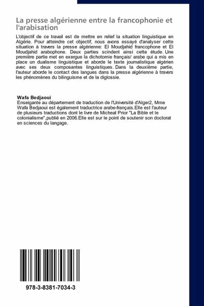 L'objectif de ce travail est de mettre en relief la situation linguistique en Algérie. Pour atteindre cet objectif, nous avons essayé d'analyser cette situation à travers la presse algérienne: El Moudjahid francophone et El Moudjahid arabophone. Deux parties scindent ainsi cette étude. Une première partie met en exergue la dichotomie français/ arabe qui a mis en place un dualisme linguistique et aborde le texte journalistique algérien avec ses deux composantes linguistiques. Dans la deuxième partie, l'auteur aborde le contact des langues dans la presse algérienne à travers les phénomènes du bilinguisme et de la diglossie.