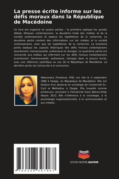 Ce livre est organisé en quatre parties : la première explique les grands débats éthiques contemporains, la deuxième traite des médias et de la société contemporaine et expose les hypothèses de la recherche. La deuxième partie contient des informations sur les médias et la société contemporaine, ainsi que les hypothèses de la recherche. La troisième partie explique les aspects théoriques des défis moraux contemporains (avortement, homosexualité, euthanasie et clonage). La quatrième partie est consacrée aux médias qui informent sur les défis moraux contemporains (avortement, homosexualité, euthanasie, clonage) dans la presse écrite, avec une référence spécifique au cas de la République de Macédoine. La dernière partie est consacrée à la conclusion.