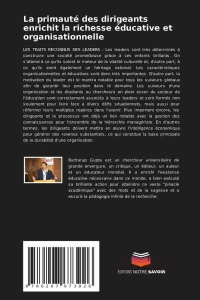 LES TRAITS RECONNUS DES LEADERS : Les leaders sont très déterminés à construire une société prometteuse grâce à ces enfants brillants. On s'attend à ce qu'ils soient le moteur de la vitalité culturelle et, d'autre part, à ce qu'ils aient également un héritage national. Les caractéristiques organisationnelles et éducatives sont donc très importantes. D'autre part, la motivation du leader est le mantra notable pour tous les suiveurs globaux afin de garantir leur position dans le domaine. Les suiveurs d'une organisation et les étudiants ou chercheurs en plein essor du secteur de l'éducation sont correctement associés à leurs leaders et sont formés non seulement pour faire face à divers défis situationnels, mais aussi pour réformer leurs multiples repères dans l'avenir. Plus important encore, les dirigeants et le processus ont déjà un lien notable avec la gestion des connaissances pour l'ensemble de la hiérarchie managériale. En d'autres termes, les dirigeants doivent mettre en oeuvre l'intelligence économique pour générer des revenus substantiels, ce qui constitue la base principale de la durabilité d'une organisation.