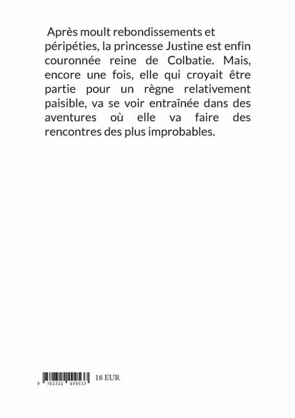 Après moult péripéties et rebondissements, la princesse Justine est enfin couronnée reine de Colbatie. Mais, encore une fois, elle qui croyait être partie pour un règne relativement paisible, va se voir entraînée dans des aventures où elle va faire des rencontres des plus improbables.