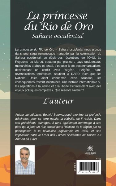 La princesse du Rio de Oro ¿ Sahara occidental nous plonge dans une saga romanesque marquée par la colonisation du Sahara occidental, en dépit des résolutions de l¿ONU. Le Royaume du Maroc, soutenu par plusieurs pays occidentaux, monarchies arabes et Israël, s¿oppose à ces recommandations, déclenchant un conflit avec l¿Algérie. L¿Algérie, sans revendications territoriales, soutient la RASD. Bien que les Nations Unies aient condamné cette situation, les conséquences restent incertaines. Une histoire internationale où les aspirations à la justice et à la liberté s¿entremêlent avec des enjeux politiques complexes. Que réserve l¿avenir ?