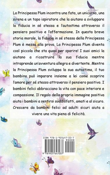 La Principessa Plum incontra una fata, un unicorno, una sirena e un topo ispiratore che la aiutano a sviluppare la fiducia in sé stessa e l’autostima attraverso il pensiero positivo e l’affermazione. In questa breve storia morale, la fiducia in sé stessa della Principessa Plum è messa alla prova. La Principessa Plum diventa così piccola che sta quasi per sparire! I suoi amici la aiutano a ricostruire la sua fiducia mentre intraprende un’avventura allegra e divertente. Mentre la Principessa Plum sviluppa la sua autostima, il tuo bambino può imparare insieme a lei come scoprire l’amore per sé stesso attraverso il pensiero positivo. I bambini felici abbracciano la vita con pace interiore e compassione. Il regalo della propria immagine positiva aiuta i bambini a sentirsi soddisfatti, amati e al sicuro. Crescere da bambini felici ad adulti sicuri aiuta a vivere una vita piena di felicità.