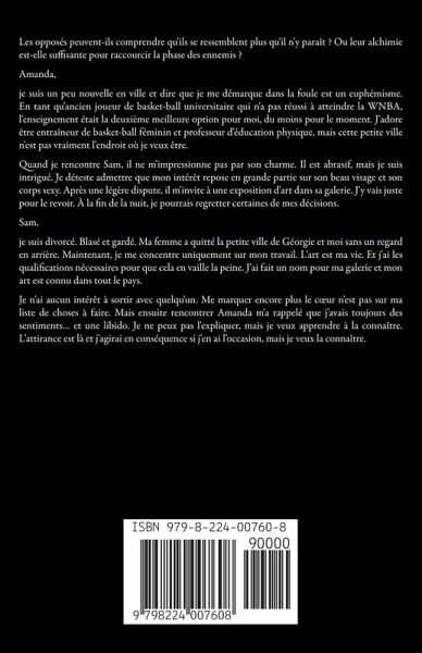 Les opposés peuvent-ils comprendre qu'ils se ressemblent plus qu'il n'y paraît ? Ou leur alchimie est-elle suffisante pour raccourcir la phase des ennemis ? Amanda, je suis un peu nouvelle en ville et dire que je me démarque dans la foule est un euphémisme. En tant qu'ancien joueur de basket-ball universitaire qui n'a pas réussi à atteindre la WNBA, l'enseignement était la deuxième meilleure option pour moi, du moins pour le moment. J'adore être entraîneur de basket-ball féminin et professeur d'éducation physique, mais cette petite ville n'est pas vraiment l'endroit où je veux être. Quand je rencontre Sam, il ne m'impressionne pas par son charme. Il est abrasif, mais je suis intrigué. Je déteste admettre que mon intérêt repose en grande partie sur son beau visage et son corps sexy. Après une légère dispute, il m'invite à une exposition d'art dans sa galerie. J'y vais juste pour le revoir. À la fin de la nuit, je pourrais regretter certaines de mes décisions. Sam, je suis divorcé. Blasé et gardé. Ma femme a quitté la petite ville de Géorgie et moi sans un regard en arrière. Maintenant, je me concentre uniquement sur mon travail. L'art est ma vie. Et j'ai les qualifications nécessaires pour que cela en vaille la peine. J'ai fait un nom pour ma galerie et mon art est connu dans tout le pays. Je n'ai aucun intérêt à sortir avec quelqu'un. Me marquer encore plus le c¿ur n'est pas sur ma liste de choses à faire. Mais ensuite rencontrer Amanda m'a rappelé que j'avais toujours des sentiments... et une libido. Je ne peux pas l'expliquer, mais je veux apprendre à la connaître. L'attirance est là et j'agirai en conséquence si j'en ai l'occasion, mais je veux la connaître.