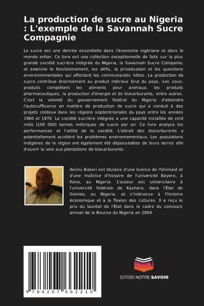 Le sucre est une denrée essentielle dans l'économie nigériane et dans le monde entier. Ce livre est une collection exceptionnelle de faits sur la plus grande société sucrière intégrée du Nigeria, la Savannah Sucre Companie, et examine le fonctionnement, les défis, la privatisation et les questions environnementales qui affectent les communautés hôtes. La production de sucre contribue énormément au produit intérieur brut du pays, ses sous-produits complètent les aliments pour animaux, les produits pharmaceutiques, la production d'énergie et de biocarburants, entre autres. C'est la volonté du gouvernement fédéral du Nigeria d'atteindre l'autosuffisance en matière de production de sucre qui a conduit à des projets coûteux dans les régions septentrionales du pays entre les années 1960 et 1970. La société sucrière intégrée a une capacité installée de cent mille (100 000) tonnes métriques de sucre par an. Ce livre analyse les performances et l'utilité de la société. L'attrait des biocarburants a potentiellement accéléré les problèmes environnementaux. Les populations indigènes de la région ont également été dépossédées de leurs terres afin d'ouvrir la voie aux plantations de biocarburants.