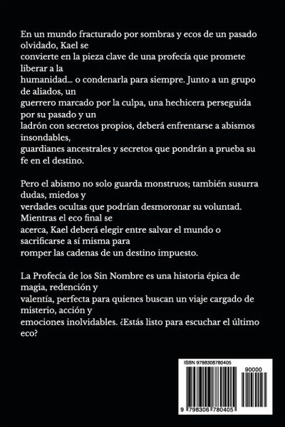 En un mundo donde los ecos del destino susurran secretos olvidados, Kael, una joven marcada por un misterio ancestral, es arrastrado a una aventura que cambiará el curso de la humanidad. Los Sin Nombre, figuras envueltas en mito, han permanecido dormidos durante siglos. Pero cuando un eco oscuro rompe su silencio, Kael y un grupo de aliados inesperados se ven obligados a desentrañar los enigmas de un mundo donde la magia es tan peligrosa como necesaria. Desde ciudades sumergidas hasta fronteras prohibidas, cada paso los acerca a una verdad que podría destruirlos o salvarlos. ¿Qué harías si tu propia voz fuera la llave para despertar fuerzas que deberían permanecer dormidas? La Profecía de los Sin Nombre no es solo una historia de fantasía, es un viaje hacia lo desconocido, donde el valor, el sacrificio y la fuerza de la unión son las únicas armas contra un destino implacable. Perfecta para los amantes de las sagas épicas, los misterios mágicos y las historias que resuenan mucho después de haber cerrado el libro. ¿Te atreves a escuchar el último eco?