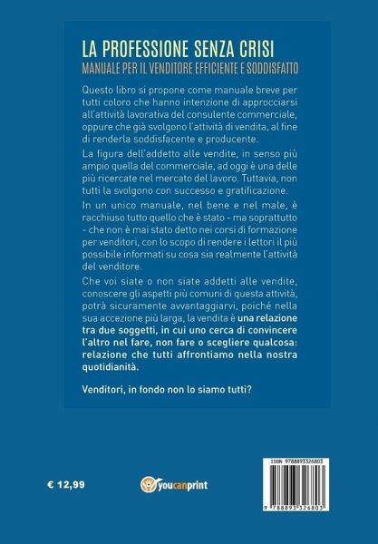 Il libro "La Professione senza crisi. Manuale per il venditore efficiente e soddisfatto" è un testo formativo rivolto a tutti coloro che hanno intenzione di approcciarsi all'attività lavorativa del consulente commerciale, oppure che già svolgono l'attività di vendita, al fine di renderla più soddisfacente e producente. La figura dell'addetto alle vendite, in senso più ampio quella del commerciale, ad oggi è una delle più ricercate nel mercato del lavoro. Tuttavia, questa non è sempre svolta con successo e gratificazione. In un unico manuale, sono racchiusi tutti gli aspetti che caratterizzano la professione del venditore, con lo scopo di rendere i lettori il più possibile informati su cosa sia realmente l'attività di vendita e come svolgerla in maniera efficiente. Il manuale si snoda attraverso l'analisi delle tipologie di venditori e il loro modus operandi, le tipologie di clienti e come approcciarli, il contratto e la sua validità, la comunicazione in tutte le sue forme, la vendita e la trattativa, l'analisi dei dati, la pianificazione strategica, la customer satisfaction e le leve del marketing, il tutto approfondito attraverso la trattazione di differenti casi concreti.