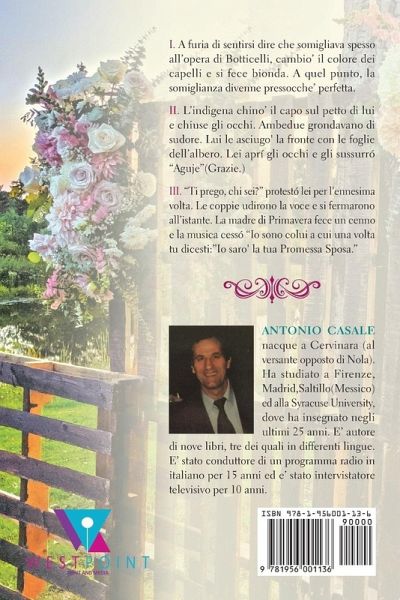 I. A furia di sentirsi dire che somigliava spesso all'opera di Botticelli, cambio' il colore dei capelli e si fece bionda. A quel punto, la somiglianza divenne pressocche' perfetta. II. L'indigena chino' il capo sul petto di lui e chiuse gli occhi. Ambedue grondavano di sudore. Lui le asciugo' la fronte con le foglie dell'albero. Lei aprí gli occhi e gli sussurró "Aguje"(Grazie.) III. "Ti prego, chi sei?" protestó lei per l'ennesima volta. Le coppie udirono la voce e si fermarono all'istante. La madre di Primavera fece un cenno e la musica cessó "Io sono colui a cui una volta tu dicesti:"Io saro' la tua Promessa Sposa."