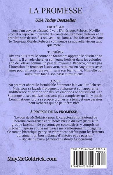 LA PROMESSEUSA TODAY BESTSELLER !PROTÉGERLors d'un voyage désespéré vers l'Amérique, Rebecca Neville promet à l'épouse mourante du comte de Stanmore d'élever et de prendre soin de son fils nouveau-né, James. Une fois arrivée dans le Nouveau Monde, Rebecca commence sa nouvelle vie, en tant que mère...TI CHÉRIRDix ans plus tard, le comte de Stanmore apprend le destin de sa famille. Il envoie chercher son jeune héritier dans les colonies afin de l'élever comme un pair du royaume. Rebecca, qui n'a pas l'intention de renoncer à son voeu, retourne en Angleterre avec James pour affronter un avenir sans son bien-aimé. Mais elle doit aussi faire face à son passé tumultueux...AIMERAu premier abord, le formidable Stanmore fait vaciller Rebecca. Mais sous sa façade froidement attirante et son apparente indifférence au sort de son fils, les émotions se bousculent. Car Stanmore et ses motivations sont plus complexes qu'il n'y paraît. L'énigmatique lord a sa propre promesse à tenir, et une passion pour Rebecca qui ne peut être niée... À propos de LA PROMESSE..."Le don de McGoldrick pour la caractérisation s'étend de l'héroïne courageuse et du héros blessé du livre jusqu'à un groupe fascinant de personnages secondaires, y compris un méchant vipérin et une maîtresse merveilleusement intrigante. Ce roman historique géorgien vibrant est parfait pour les lecteurs qui aiment un bon mélange d'histoire et de passion."- Booklist Review (American Library Association) Si vous avez aimé Belle ou Bridgerton, vous voudrez essayer ce best-seller de USA Today, qui démarre une série de romans d'amour géorgiens et de régence. Idéal pour les fans de Grace Burrowes, Julia Quinn, Julie Garwood, Mary Balogh, Christi Caldwell, Julie Johnstone, Scarlett Scott, Amalie Howard, Sarah MacLean, Lisa Kleypas, Sabrina Jeffries, Eloisa James, Sophie Jordan, Grace Callaway, Tessa Dare, Erica Ridley, Mary Jo Putney, Kelly Bowen, Glynnis Campbell, Amanda Scott, Lynsay Sands, Elisa Braden, Tanya Anne Crosby, Kerrigan Byrne, Maeve Greyson, Tessa Candle, Chloe Flowers, Lucy Langton, Alexa Aston, Suzanne Enoch, Susan King, Claire Delacroix, Amy Jarecki, Maddison Michaels, Vanessa Kelly, Darcy Burke, Jess Michaels, Madeline Hunter, Philippa Gregory ou Kate Bateman.