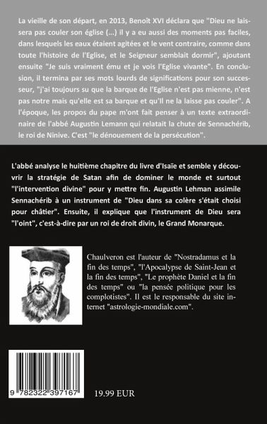 La vieille de son départ, en 2013, Benoît XVI déclara que "Dieu ne laissera pas couler son église (...) il y a eu aussi des moments pas faciles, dans lesquels les eaux étaient agitées et le vent contraire, comme dans toute l'histoire de l'Eglise, et le Seigneur semblait dormir", ajoutant ensuite "Je suis vraiment ému et je vois l'Eglise vivante". En conclusion, il termina par ses mots lourds de significations pour son successeur, "j'ai toujours su que la barque de l'Eglise n'est pas mienne, n'est pas notre mais qu'elle est sa barque et qu'Il ne la laisse pas couler".A l'époque, les propos du pape m'ont fait penser à un texte extraordinaire de l'abbé Augustin Lemann qui relatait la chute de Sennachérib, le roi de Ninive. C'est "le dénouement de la persécution" que l'on peut lire sur le site des Amis du Christ Roi de France.L'abbé analyse le huitième chapitre du livre d'Isaïe et semble y découvrir la stratégie de Satan afin de dominer le monde et surtout "l'intervention divine" pour y mettre fin. Car l'objectif de Satan est de faire croire que tout est perdus pour nous, mais sachez que Dieu intervient toujours pour vaincre le mal. Augustin Lehman assimile Sennachérib à un instrument de "Dieu dans sa colère s'était choisi pour châtier".Ensuite, l'Abbé Lemann explique que l'instrument de Dieu sera "l'oint", c'est-à-dire par un roi de droit divin. Il vise sans doute le Grand Monarque de la fin des temps.