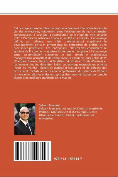 Cet ouvrage expose le rôle croissant de la Propriété Intellectuelle dans la vie des entreprises, notamment dans l'élaboration de leurs stratégies commerciales. Il souligne la contribution de la Propriété Intellectuelle ("PI") à l'économie nationale libanaise, au PIB et à l'emploi. Cet ouvrage définit, par ailleurs, une série d'obstacles qui empêchent le développement de la PI privant ainsi les entreprises de profiter d'une croissance potentielle. Les entreprises, elles-mêmes, considèrent le système de PI comme un système ésotérique et complexe ! Cet ouvrage tente en conséquent d'apporter un outil simple et pratique aux managers leur permettant de comprendre la valeur de leurs actifs de PI (Marques, Brevets, Dessins et Modèles industriels et Droits d'auteur) et les moyens des les défendre. Enfin, cet ouvrage reproduit un schéma inédit du marché libanais en matière d'évaluation et de défense des actifs de PI, contribuant ainsi à la compréhension du système de PI dans le monde des affaires et des entreprises d'un marché libanais qui semble aspirer à de meilleurs standards en la matière.