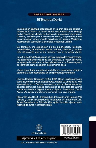 La COLECCI¿¿N SALMOS est¿¿ basada en la gran obra de Charles H. Spurgeon: "El Tesoro de David", un comentario a toda la Biblia ¿¿a la luz de los Salmos¿¿ considerados como una s¿¿ntesis de todo el mensaje de la Escritura. Cada texto b¿¿blico, del G¿¿nesis al Apocalipsis, encuentra en "El Tesoro de David" su correspondiente enlace a un vers¿¿culo de los Salmos. ¿¿El que habita al abrigo del Alt¿¿simo morar¿¿ bajo la sombra del Omnipotente¿¿ (Salmo 91:1). El tema del Salmo 91 es "La Protecci¿¿n" divina del principio hasta el final. No hay en todo el salterio un salmo m¿¿s alentador; el tono elevado con que empieza se mantiene de principio al fin; la fe exhibe en sus estrofas sus mejores galas, y todo ¿¿l exhala seguridad y nobleza. En una sociedad como la nuestra en la que los antidepresivos se han convertido en un producto de consumo generalizado, la lectura peri¿¿dica del Salmo 91es obligada. Cierto m¿¿dico alem¿¿n sol¿¿a referirse al mismo como "la mejor vacuna mental durante ¿¿pocas de dificultad"; y ciertamente es medicina celestial: el ant¿¿doto an¿¿mico m¿¿s eficaz ante la adversidad. Quien sea es capaz de leer este salmo, aplic¿¿rselo y vivir en el esp¿¿ritu del mismo, jam¿¿s conocer¿¿ lo que es sentir miedo. El prop¿¿sito de la COLECCI¿¿N SALMOS es fomentar la lectura devocional de la Biblia, leyendo los Salmos de una manera distinta: En 4 versiones comparadas (Reina Valera 1960 - Reina Valera 1977 - Nueva Versi¿¿n Internacional - La Biblia de las Am¿¿ricas; y una versi¿¿n pö¿tica en rima) y a su vez, enlazando el texto de cada vers¿¿culo del Salmo con otros pasajes de la Escritura. Cada vers¿¿culo viene comentado de forma devocional por el gran predicador Charles H. Spurgeon (autor de "Lecturas Matutinas", "Lecturas Vespertinas", "El libro de cheques del banco de la fe" ); y adem¿¿s por centenares de otros grandes expositores de la Palabra a lo largo de la historia. Estos comentarios enlazan cada vers¿¿culo del Salmo con otros pasajes de la Escritura mediante citas a pie de p¿¿gina. Si el lector busca y lee cada una de estas citas, acabar¿¿ por leer toda la Biblia: del G¿¿nesis al Apocalipsis; a la vez que enriquece su vida espiritual con una comprensi¿¿n distinta del mensaje de los Salmos. ¿¿Una forma diferente de leer la Biblia... A LA LUZ DE LOS SALMOS! Cada Salmo individual se presenta con un t¿¿tulo tem¿¿tico que refleja el tema principal del mismo con el prop¿¿sito de facilitar la elecci¿¿n del lector seg¿¿n las preferencias o necesidades. Y cada libro individual contiene el TEXTO COMPLETO del comentario al Salmo en la obra matriz de: "El Tesoro de David".