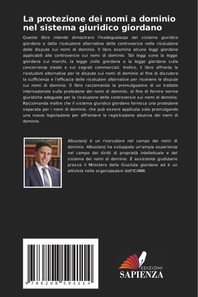 Questo libro intende dimostrare l'inadeguatezza del sistema giuridico giordano e della risoluzione alternativa delle controversie nella risoluzione delle dispute sui nomi di dominio. Il libro esamina alcune leggi giordane applicabili alle controversie sui nomi di dominio. Tali leggi sono la legge giordana sui marchi, la legge civile giordana e la legge giordana sulla concorrenza sleale e sui segreti commerciali. Inoltre, il libro affronta le risoluzioni alternative per le dispute sui nomi di dominio al fine di discutere la sufficienza e l'efficacia delle risoluzioni alternative per risolvere le dispute sui nomi di dominio. Il libro raccomanda la promulgazione di un trattato internazionale sulla protezione dei nomi di dominio, al fine di fornire norme giuridiche adeguate per la risoluzione delle controversie sui nomi di dominio. Raccomanda inoltre che il sistema giuridico giordano fornisca una protezione separata per i nomi di dominio, che può essere applicata solo promulgando una nuova legislazione per affrontare la registrazione abusiva dei nomi di dominio.