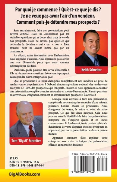 Par quoi je commence ? Qu’est-ce que je dis ? Je ne veux pas avoir l’air d’un vendeur. Comment puis-je détendre mes prospects ? Sans entraînement, faire des présentations peut s’avérer difficile. Nous ne connaissons pas les véritables questions qui se bousculent dans la tête de nos prospects. Nous ne savons pas qu’est-ce qui déclenche la décision « oui » ou « non ». Bien souvent, nous ne savons même pas par où commencer. Au départ, notre fascination pour l’information nous empêche d’avancer. Nous n’arrivons pas à avoir une vue d’ensemble parce que nous sommes submergés par des faits. D’ailleurs, quelle pourrait être la vue d’ensemble ? Elle se résume à une question : Est-ce que le prospect désire joindre notre entreprise ou pas ? Que se produirait-il si nous changions complètement nos modèles de prise de rendez-vous et de présentation ? D’abord, si nous apprenions à obtenir des rendez-vous avec près de 100% des prospects à qui l’on parle. Ensuite, si nous apprenions à fournir une présentation complète de notre entreprise en moins d’une minute. Si nous pouvions en arriver à ça, imaginons comment se sentiraient nos prospects ? Électrisés ! Lorsque nous arrivons à faire une présentation complète de notre entreprise en moins d’une minute, plusieurs bonnes choses se produisent. Nous épargnons du temps, le nôtre et celui de notre prospect. Ce qui fait deux heureux. Cela nous procure aussi la flexibilité de faire des présentations n’importe où, n’importe quand et en toutes circonstances. Et finalement, toute tension reliée à la dynamique de vente disparait chez nos prospects en apprenant que notre présentation ne durera qu’une minute. Apprenez comment faire exploser votre entreprise avec cette technique de présentation efficace, condensée et focalisée.
