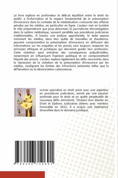 Le livre explore en profondeur le délicat équilibre entre le droit du public à l'information et le respect fondamental de la présomption d'innocence dans le contexte de la médiatisation croissante des affaires pénales par les médias, en particulier en ligne. L'auteur met en lumière le rôle prépondérant que joue désormais le journalisme d'investigation dans la sphère médiatique, souvent parallèle aux procédures judiciaires traditionnelles. À travers une analyse approfondie, le texte expose comment les médias, dans leur quête de nouvelles et d'audience, peuvent compromettre la présomption d'innocence en diffusant des informations sur les enquêtes et les procès sans toujours respecter les principes éthiques et juridiques qui devraient guider leur profession. Cette violation peut entraîner des conséquences préjudiciables, notamment en influençant l'opinion publique et en compromettant l'équité des procès. L'auteur explore également les défis rencontrés dans la répression de la violation de la présomption d'innocence par les médias, soulignant les limites des infractions existantes telles que la diffamation ou la dénonciation calomnieuse.