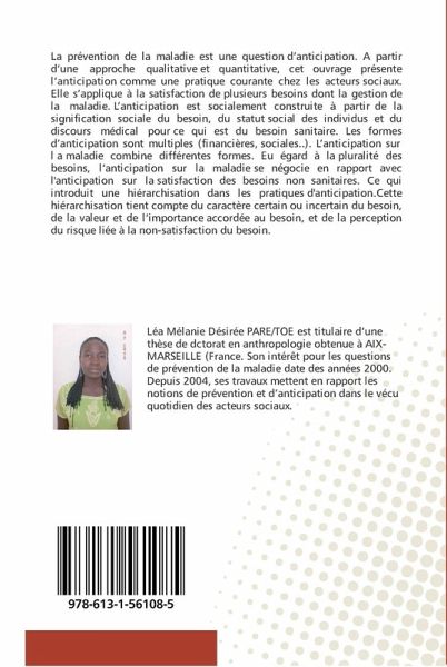 La prévention de la maladie est une question d'anticipation. A partir d'une approche qualitative et quantitative, cet ouvrage présente l'anticipation comme une pratique courante chez les acteurs sociaux. Elle s'applique à la satisfaction de plusieurs besoins dont la gestion de la maladie. L'anticipation est socialement construite à partir de la signification sociale du besoin, du statut social des individus et du discours médical pour ce qui est du besoin sanitaire. Les formes d'anticipation sont multiples (financières, sociales..). L'anticipation sur la maladie combine différentes formes. Eu égard à la pluralité des besoins, l'anticipation sur la maladie se négocie en rapport avec l'anticipation sur la satisfaction des besoins non sanitaires. Ce qui introduit une hiérarchisation dans les pratiques d'anticipation.Cette hiérarchisation tient compte du caractère certain ou incertain du besoin, de la valeur et de l'importance accordée au besoin, et de la perception du risque liée à la non-satisfaction du besoin.