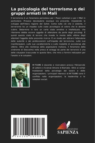 Il terrorismo è un fenomeno pericoloso per i Paesi saheliani e per il Mali in particolare. Provoca desolazione ovunque sia presente, impedendo lo sviluppo dell'intera regione del Sahel. Come tutto ciò che è violento, il terrorismo ha un impatto sullo stato psicologico di coloro che lo devono subire. Determina in loro un certo stato emotivo e intellettuale, che riteniamo debba essere oggetto di attenzione da parte degli psicologi. È quindi questo stato di terrore che invade la mente delle vittime degli attentati l'oggetto della presente ricerca. È un modo per attirare l'attenzione delle autorità e dei professionisti sull'impatto del terrorismo, sulle sue manifestazioni, sulle sue caratteristiche e sulle modalità di assistenza alle vittime. Oltre alla resilienza della popolazione maliana, il fenomeno della sindrome di Stoccolma nella presa di ostaggi da parte dei terroristi è una delle situazioni trascurate in questo libro, che mira a fornire indicazioni per l'analisi e le soluzioni.