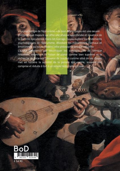 « La psychologie de l'épicurisme » de Jean-Marie Guyau est une oeuvre philosophique majeure qui offre une analyse approfondie et novatrice de la doctrine épicurienne. Dans cet ouvrage, Guyau explore les fondements psychologiques de l'épicurisme, dévoilant les mécanismes mentaux et émotionnels qui sous-tendent cette philosophie antique influente. L'auteur commence par décortiquer les concepts clés de l'éthique hédoniste, examinant la notion de plaisir comme bien suprême et la recherche de l'ataraxie (absence de trouble) comme idéal de vie. Guyau met en lumière la subtilité de la pensée épicurienne, souvent mal comprise et réduite à tort à un simple hédonisme grossier. Au fil des chapitres, l'ouvrage explore la psychologie derrière les préceptes épicuriens, analysant comment la recherche du plaisir et l'évitement de la douleur façonnent la morale et le comportement humain. Guyau examine en détail la conception épicurienne de l'ame, du libre arbitre et des passions, offrant une perspective unique sur ces questions philosophiques fondamentales. « La psychologie de l'épicurisme » s'inscrit naturellement dans les catégories « Philosophie antique », « Psychologie et comportement » et « Histoire des idées ». Guyau y déploie une analyse rigoureuse qui allie profondeur philosophique et insights psychologiques, rendant accessible la complexité de la pensée épicurienne. L'ouvrage aborde également les implications pratiques de l'épicurisme, explorant comment cette philosophie peut guider la quete du bonheur et de la sagesse dans la vie quotidienne. Guyau met en perspective l'épicurisme avec d'autres courants philosophiques, offrant une réflexion stimulante sur la morale du bonheur et l'eudémonisme. Ce livre reste une référence incontournable pour quiconque s'intéresse à la philosophie antique, à l'éthique ou à la psychologie philosophique. La profondeur de l'analyse de Guyau et sa capacité à rendre vivante et pertinente une philosophie millénaire en font une lecture essentielle pour les étudiants, les chercheurs et les amateurs de philosophie.