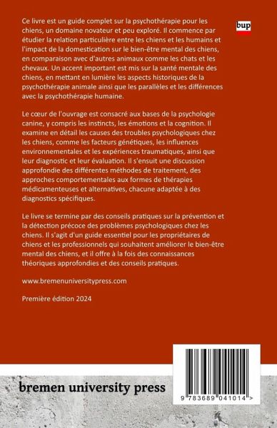 Ce livre est un guide complet sur la psychothérapie pour les chiens, un domaine novateur et peu exploré. Il commence par étudier la relation particulière entre les chiens et les humains et l'impact de la domestication sur le bien-être mental des chiens, en comparaison avec d'autres animaux comme les chats et les chevaux. Un accent important est mis sur la santé mentale des chiens, en mettant en lumière les aspects historiques de la psychothérapie animale ainsi que les parallèles et les différences avec la psychothérapie humaine. Le c¿ur de l'ouvrage est consacré aux bases de la psychologie canine, y compris les instincts, les émotions et la cognition. Il examine en détail les causes des troubles psychologiques chez les chiens, comme les facteurs génétiques, les influences environnementales et les expériences traumatiques, ainsi que leur diagnostic et leur évaluation. Il s'ensuit une discussion approfondie des différentes méthodes de traitement, des approches comportementales aux formes de thérapies médicamenteuses et alternatives, chacune adaptée à des diagnostics spécifiques. Le livre se termine par des conseils pratiques sur la prévention et la détection précoce des problèmes psychologiques chez les chiens. Il s'agit d'un guide essentiel pour les propriétaires de chiens et les professionnels qui souhaitent améliorer le bien-être mental des chiens, et il offre à la fois des connaissances théoriques approfondies et des conseils pratiques.