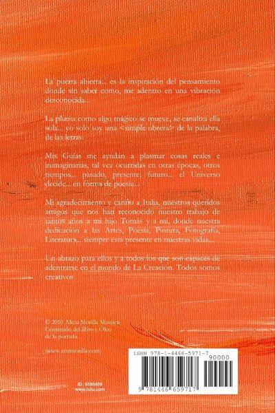 La puerta abierta... es la inspiración del pensamiento donde sin saber como, me adentro en una vibración desconocida... La pluma como algo mágico se mueve, se canaliza ella sola... yo solo soy una de la palabra, de las letras. Mis Guías me ayudan a plasmar cosas reales e inimaginarias, tal vez ocurridas en otras épocas, otros tiempos... pasado, presente, futuro... el Universo decide... en forma de poesía... Mi agradecimiento y cariño a Italia, nuestros queridos amigos que nos han reconocido nuestro trabajo de tantos años a mi hijo Tomás y a mí, donde nuestra dedicación a las Artes, Poesía, Pintura, Fotografía, Literatura... siempre está presente en nuestras vidas... Un abrazo para ellos y a todos los que son capaces de adentrarse en el mundo de La Creación. Todos somos creativos