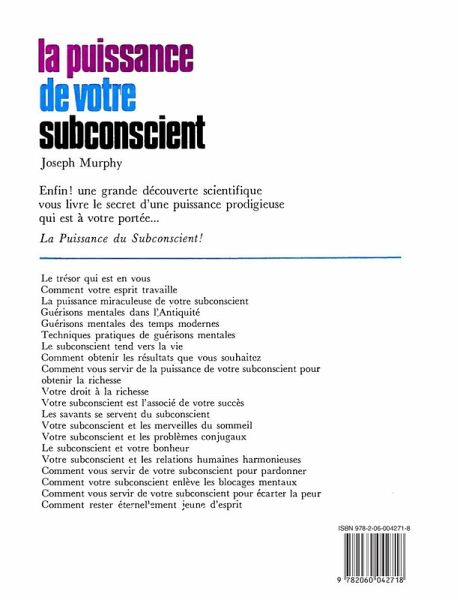 Dans cet ouvrage, le célèbre docteur Joseph Murphy s'applique à montrer en quoi l'imagerie mentale et la façon de penser d'un individu peuvent modeler singulièrement sa destinée. Dans un langage qui se veut le plus clair possible, il explique les voies, les ressorts et les richesses de l'inconscient et propose des techniques éprouvées pour exploiter dans le quotidien les ressources intarissables de l'esprit.