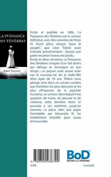 Ecrite et publiée en 1886, La Puissance des Ténèbres est la version définitive, avec des variantes de l'Acte IV, d'une pièce conçue "pour le peuple", que Léon Tolstoï avait intitulée primitivement : Quand une patte est prise l'oiseau est perdu.
