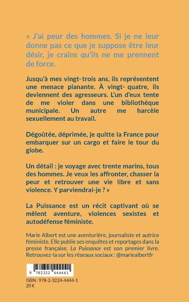 « J'ai peur des hommes. Si je ne leur donne pas ce que je suppose être leur désir, je crains qu'ils ne me prennent de force.Jusqu'à mes vingt-trois ans, ils représentent une menace planante. À vingt-quatre, ils deviennent des agresseurs.L'un d'eux tente de me violer dans une bibliothèque municipale. Un autre me harcèle sexuellement au travail.Je tombe amoureuse d'un troisième qui me jette après m'avoir baisée.Dégoûtée, déprimée, je quitte la France pour embarquer sur un cargo et faire le tour du globe.Un détail : je voyage avec trente marins, tous des hommes. Je veux les affronter, chasser la peur et retrouver une vie libre et sans violence.Y parviendrai-je ? »La Puissance est un récit captivant où se mêlent aventure, violences sexistes et autodéfense féministe.