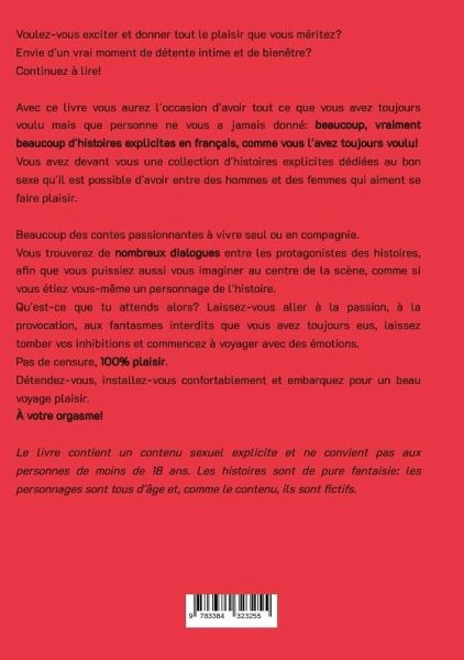 Voulez-vous exciter et donner tout le plaisir que vous méritez?Envie d'un vrai moment de détente intime et de bienêtre?Continuez à lire!Avec ce livre vous aurez l'occasion d'avoir tout ce que vous avez toujours voulu mais que personne ne vous a jamais donné: beaucoup, vraiment beaucoup d'histoires explicites en français, comme vous l'avez toujours voulu!Vous avez devant vous une collection d'histoires explicites dédiées au bon sexe qu'il est possible d'avoir entre des hommes et des femmes qui aiment se faire plaisir. Beaucoup des contes passionnantes à vivre seul ou en compagnie.Vous trouverez de nombreux dialogues entre les protagonistes des histoires, afin que vous puissiez aussi vous imaginer au centre de la scène, comme si vous étiez vous-même un personnage de l'histoire.Qu'est-ce que tu attends alors? Laissez-vous aller à la passion, à la provocation, aux fantasmes interdits que vous avez toujours eus, laissez tomber vos inhibitions et commencez à voyager avec des émotions.Pas de censure, 100 pour 100 de plaisir.Détendez-vous, installez-vous confortablement et embarquez pour un beau voyage plaisir.À votre orgasme!