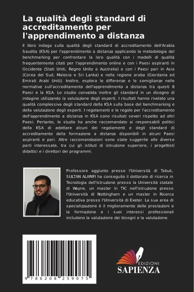 Il libro indaga sulla qualità degli standard di accreditamento dell'Arabia Saudita (KSA) per l'apprendimento a distanza applicando la metodologia del benchmarking per confrontare la loro qualità con i modelli di qualità frequentemente citati per l'apprendimento online e con i Paesi aspiranti in Occidente (Stati Uniti, Regno Unito e Australia) e con i Paesi pari in Asia (Corea del Sud, Malesia e Sri Lanka) e nella regione araba (Giordania ed Emirati Arabi Uniti). Inoltre, esplora le differenze e le somiglianze nelle normative sull'accreditamento dell'apprendimento a distanza tra questi 8 Paesi e la KSA. Lo studio convalida inoltre gli standard in un disegno di indagine utilizzando la valutazione degli esperti. I risultati hanno rivelato una qualità complessiva degli standard della KSA sulla base del benchmarking e della valutazione degli esperti. I regolamenti e le regole per l'accreditamento dell'apprendimento a distanza in KSA sono risultati severi rispetto ad altri Paesi. Pertanto, lo studio ha anche raccomandato ai responsabili politici della KSA di adottare alcuni dei regolamenti e degli standard di accreditamento della formazione a distanza disponibili in alcuni Paesi aspiranti e pari. Altre raccomandazioni sono state suggerite alle diverse parti interessate, tra cui gli istituti di istruzione superiore, i progettisti didattici e i direttori dei programmi.