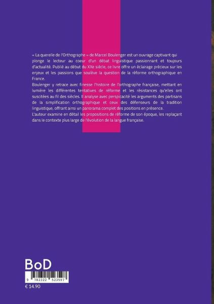« La querelle de l'Orthographe » de Marcel Boulenger est un ouvrage captivant qui plonge le lecteur au coeur d'un débat linguistique passionnant et toujours d'actualité. Publié au début du XXe siècle, ce livre offre un éclairage précieux sur les enjeux et les passions que soulève la question de la réforme orthographique en France. Boulenger y retrace avec finesse l'histoire de l'orthographe française, mettant en lumière les différentes tentatives de réforme et les résistances qu'elles ont suscitées au fil des siècles. Il analyse avec perspicacité les arguments des partisans de la simplification orthographique et ceux des défenseurs de la tradition linguistique, offrant ainsi un panorama complet des positions en présence. L'auteur examine en détail les propositions de réforme de son époque, les replaçant dans le contexte plus large de l'évolution de la langue française. Il s'interroge sur les implications pédagogiques d'une éventuelle simplification, tout en soulignant l'importance de l'orthographe dans la préservation du patrimoine littéraire et culturel français. « La querelle de l'Orthographe » s'inscrit naturellement dans les catégories « Linguistique », « Histoire de la langue française » et « Essais littéraires » sur les plateformes de vente en ligne. Boulenger y déploie un style élégant et incisif, rendant accessible un sujet complexe tout en maintenant une réflexion de haute volée. L'ouvrage ne se contente pas d'exposer les termes du débat ; il invite le lecteur à une réflexion profonde sur la nature même de la langue et son évolution. Boulenger explore les liens entre orthographe et identité nationale, entre tradition et modernité, offrant ainsi une perspective riche sur les enjeux culturels et sociaux de la réforme orthographique. Plus qu'un simple témoignage historique, « La querelle de l'Orthographe » reste d'une étonnante actualité, alors que les débats sur la simplification de l'orthographe continuent d'animer la société française. Il offre des clés de compréhension précieuses pour quiconque s'intéresse à l'avenir de la langue française et aux défis de son enseignement.