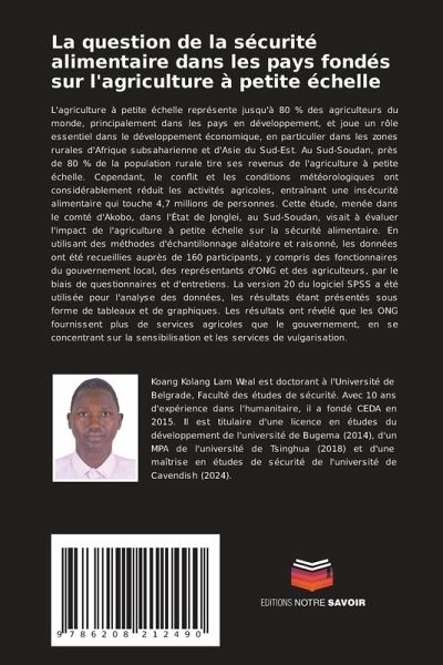 L'agriculture à petite échelle représente jusqu'à 80 % des agriculteurs du monde, principalement dans les pays en développement, et joue un rôle essentiel dans le développement économique, en particulier dans les zones rurales d'Afrique subsaharienne et d'Asie du Sud-Est. Au Sud-Soudan, près de 80 % de la population rurale tire ses revenus de l'agriculture à petite échelle. Cependant, le conflit et les conditions météorologiques ont considérablement réduit les activités agricoles, entraînant une insécurité alimentaire qui touche 4,7 millions de personnes. Cette étude, menée dans le comté d'Akobo, dans l'État de Jonglei, au Sud-Soudan, visait à évaluer l'impact de l'agriculture à petite échelle sur la sécurité alimentaire. En utilisant des méthodes d'échantillonnage aléatoire et raisonné, les données ont été recueillies auprès de 160 participants, y compris des fonctionnaires du gouvernement local, des représentants d'ONG et des agriculteurs, par le biais de questionnaires et d'entretiens. La version 20 du logiciel SPSS a été utilisée pour l'analyse des données, les résultats étant présentés sous forme de tableaux et de graphiques. Les résultats ont révélé que les ONG fournissent plus de services agricoles que le gouvernement, en se concentrant sur la sensibilisation et les services de vulgarisation.