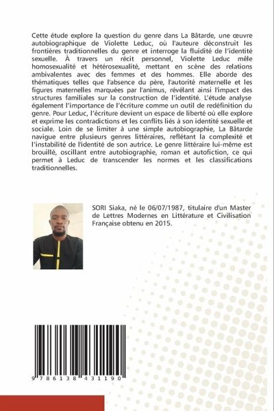 Cette étude explore la question du genre dans La Bâtarde, une oeuvre autobiographique de Violette Leduc, où l'auteure déconstruit les frontières traditionnelles du genre et interroge la fluidité de l'identité sexuelle. À travers un récit personnel, Violette Leduc mêle homosexualité et hétérosexualité, mettant en scène des relations ambivalentes avec des femmes et des hommes. Elle aborde des thématiques telles que l'absence du père, l'autorité maternelle et les figures maternelles marquées par l'animus, révélant ainsi l'impact des structures familiales sur la construction de l'identité. L'étude analyse également l'importance de l'écriture comme un outil de redéfinition du genre. Pour Leduc, l'écriture devient un espace de liberté où elle explore et exprime les contradictions et les conflits liés à son identité sexuelle et sociale. Loin de se limiter à une simple autobiographie, La Bâtarde navigue entre plusieurs genres littéraires, reflétant la complexité et l'instabilité de l'identité de son autrice. Le genre littéraire lui-même est brouillé, oscillant entre autobiographie, roman et autofiction, ce qui permet à Leduc de transcender les normes et les classifications traditionnelles.